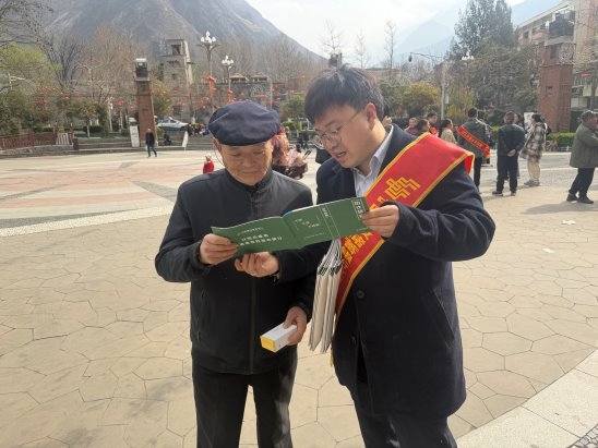 (图说:图为邮储银行汶川县支行工作人员向群众普及金融知识)